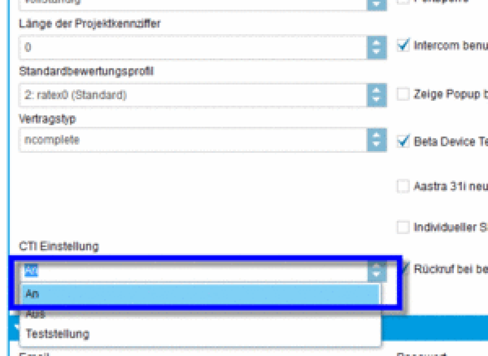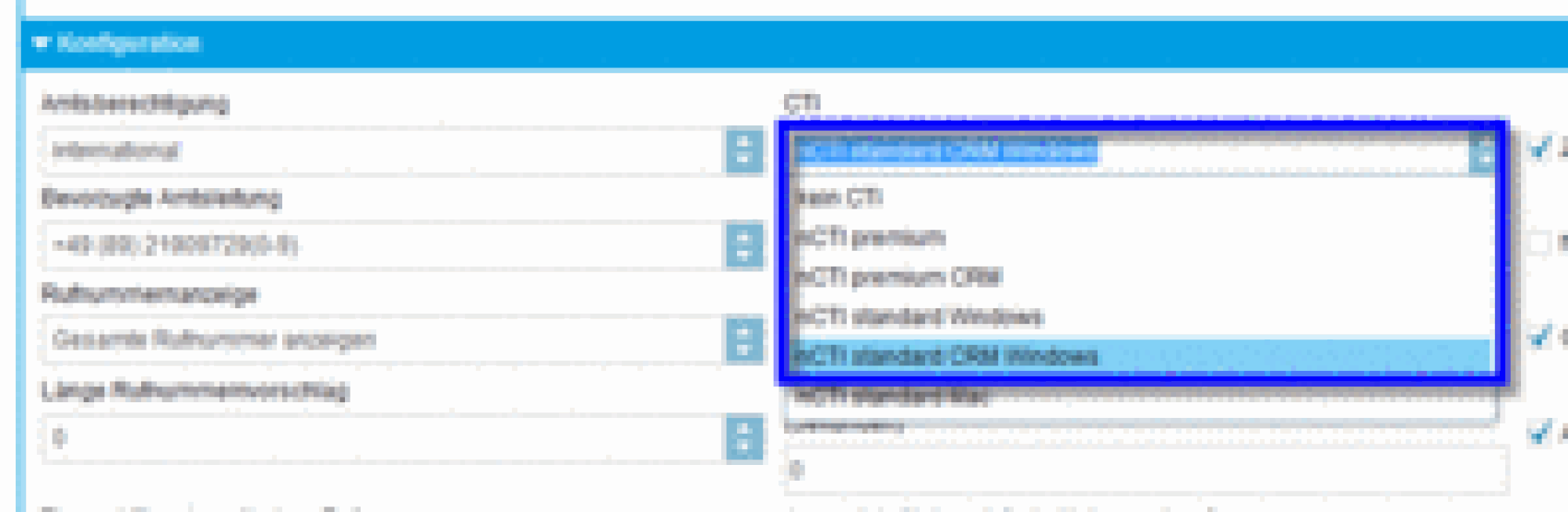 Unter Administration/Profil muss die CTI Option auf "An" eingestellt sein. Bitte kontaktieren Sie dazu Ihren systemtechnischen Ansprechpartner, um diese Funktion für Sie freizuschalten.