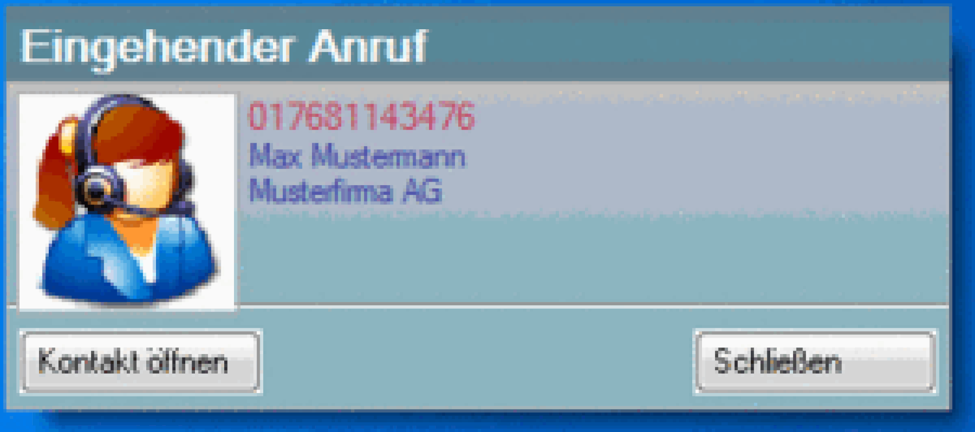 Wenn Sie den Kontakt des Anrufers bereits in Ihrem Outlook hinterlegt haben, wird Ihnen dieser nun in dem Screenpopup mit dem Namen, der Firma, der Telefonnummer etc. angezeigt.