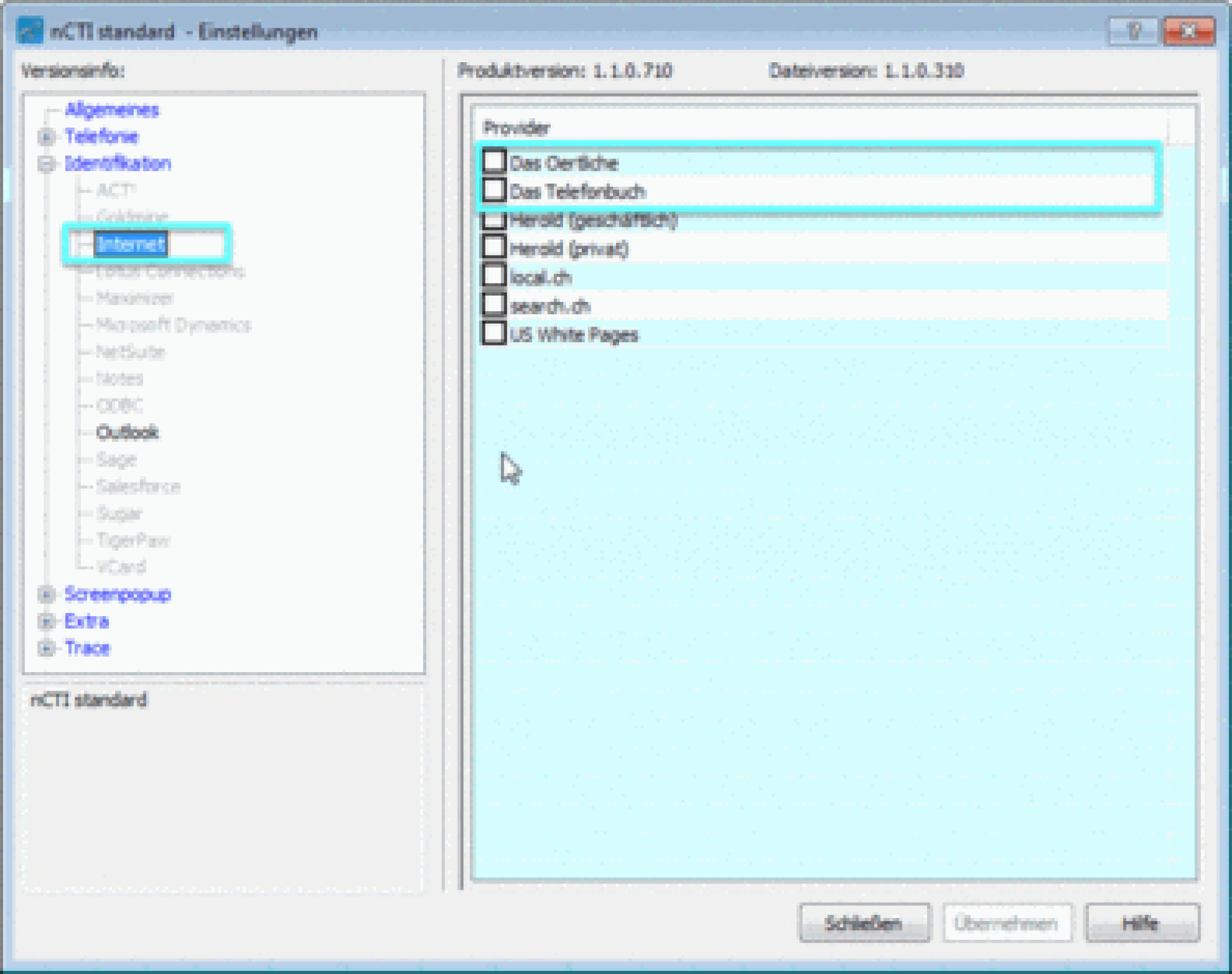-Klicken Sie nun auf der linken Seite auf Identifikation und wählen Sie Internet. Hier können Sie nun beispielsweise einen Haken bei "Das Örtliche" setzten.