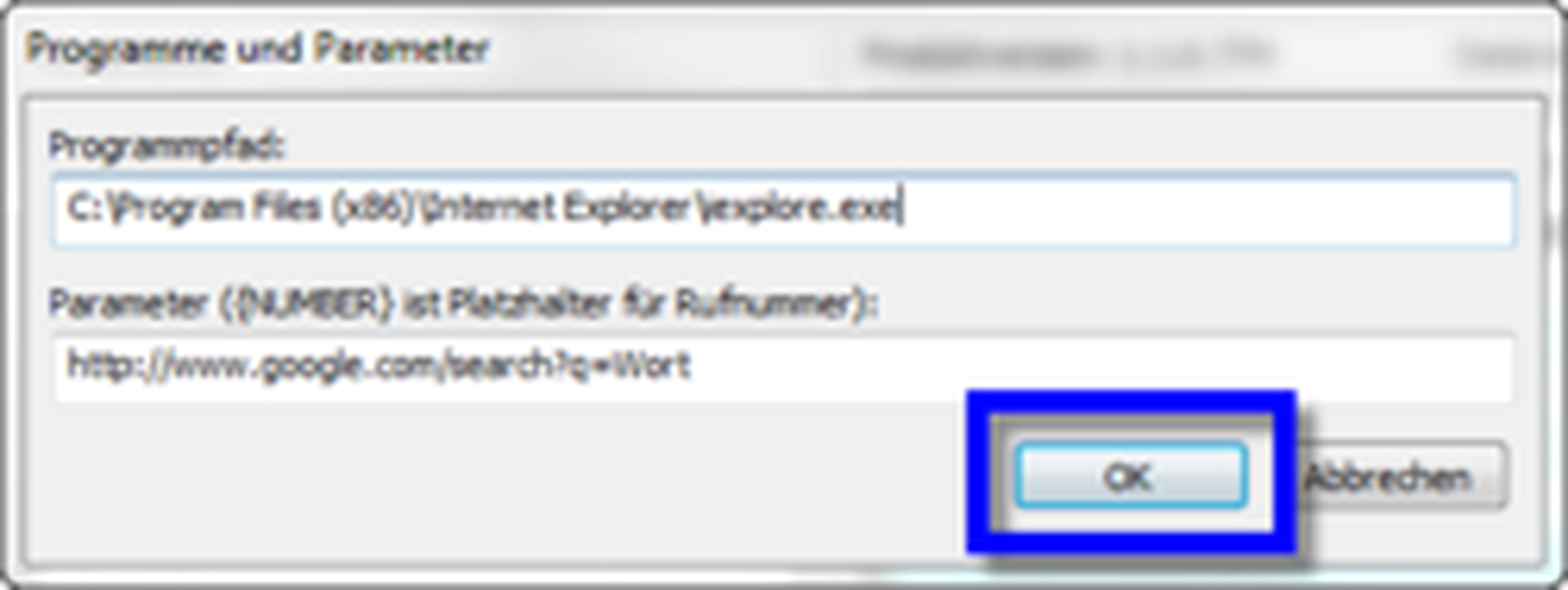 -Unter Parameter geben Sie die URL der Webseite (inklusive HTTP://) oder den Parameter ein, der an die ausführbare Datei übergeben werden soll. Z. B.: {NUMBER}