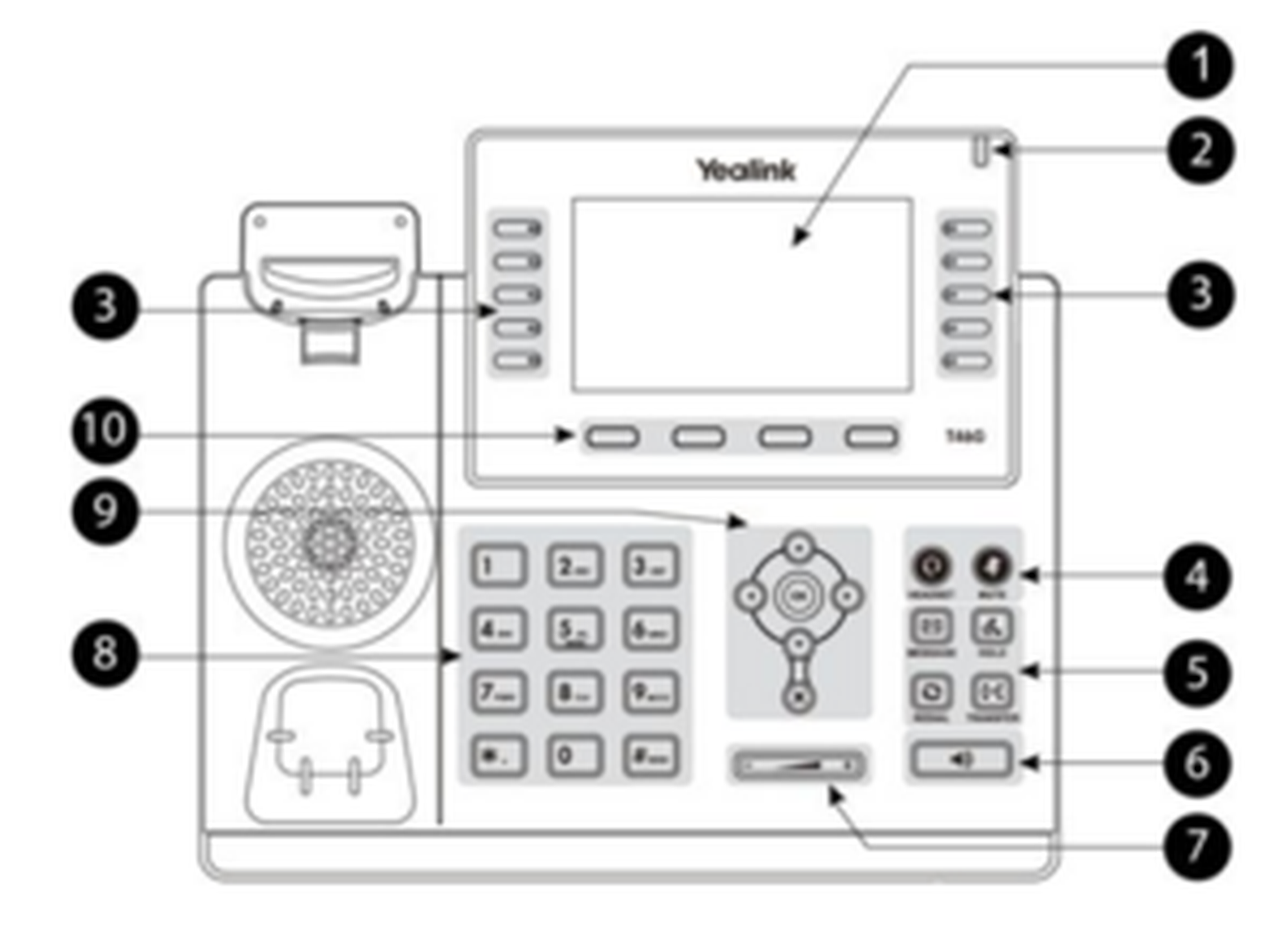 | 6 | Tasten für Headset, Stummschaltung, Voicemail, Wahlwiederholung, Halten und Anrufweiterleitung |