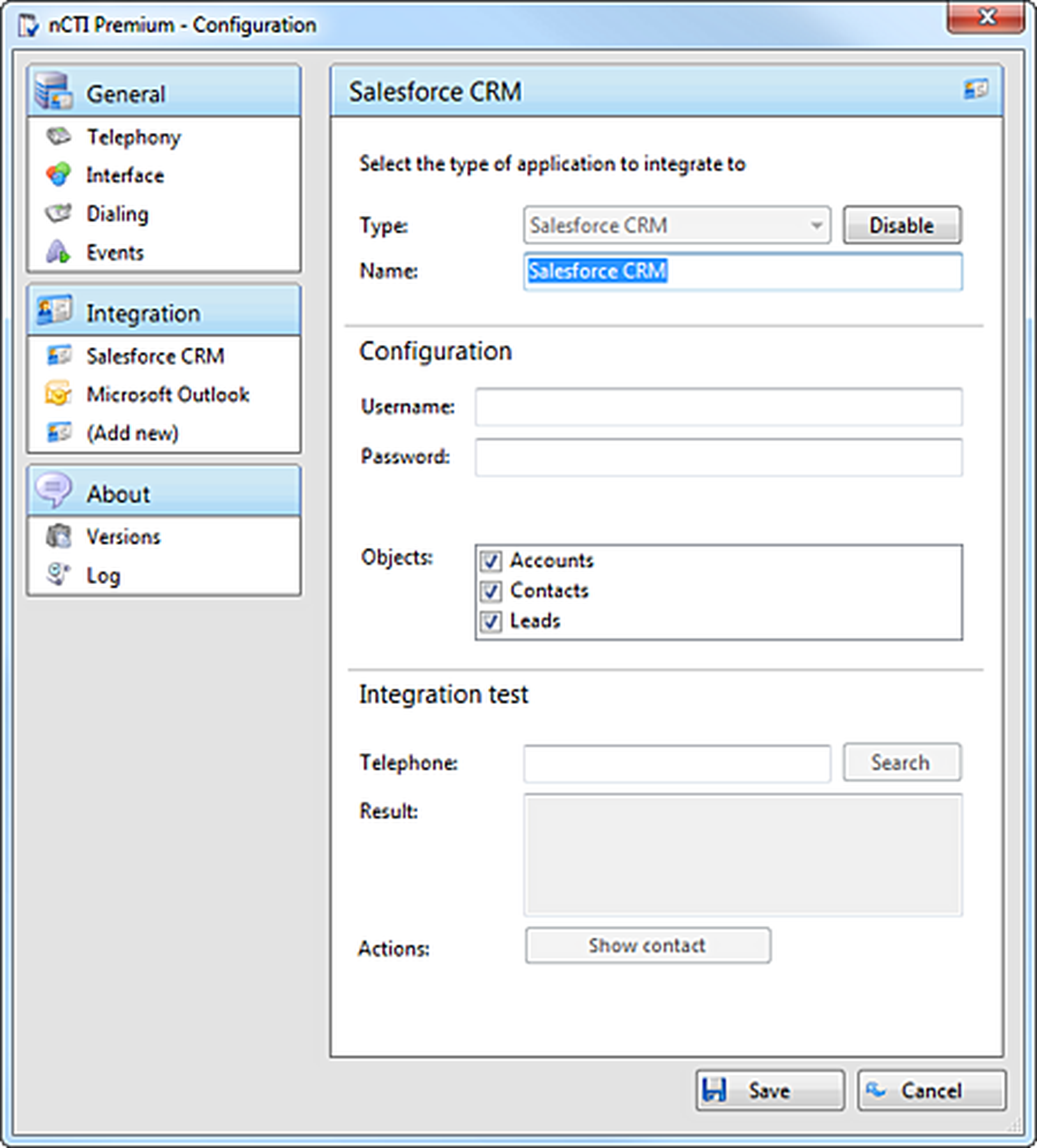 | Telephone | Enter a telephone number to start an integration test. If successful, information will be displayed in the lower field. |